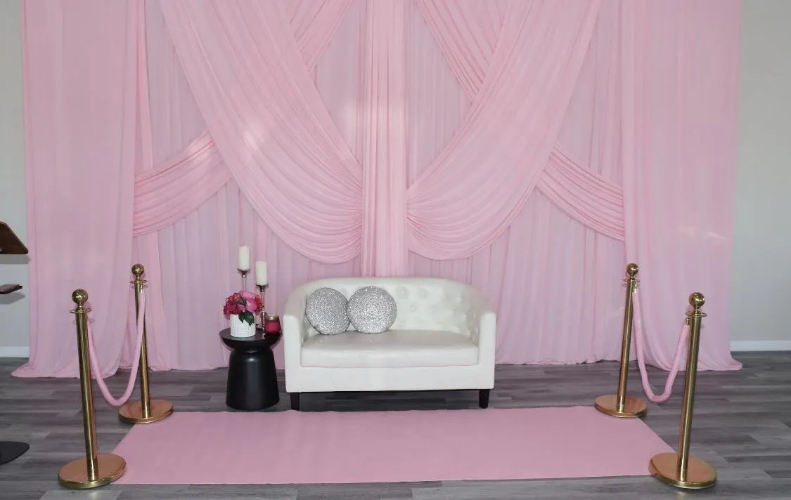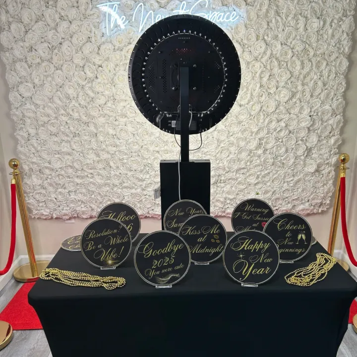 Our premium photo booth experiences feature DSLR, Digital Selfie, and 360 booths paired with LED backdrops and enclosures, customizable designs, and optional balloon décor or elegant draping for a fully elevated look.